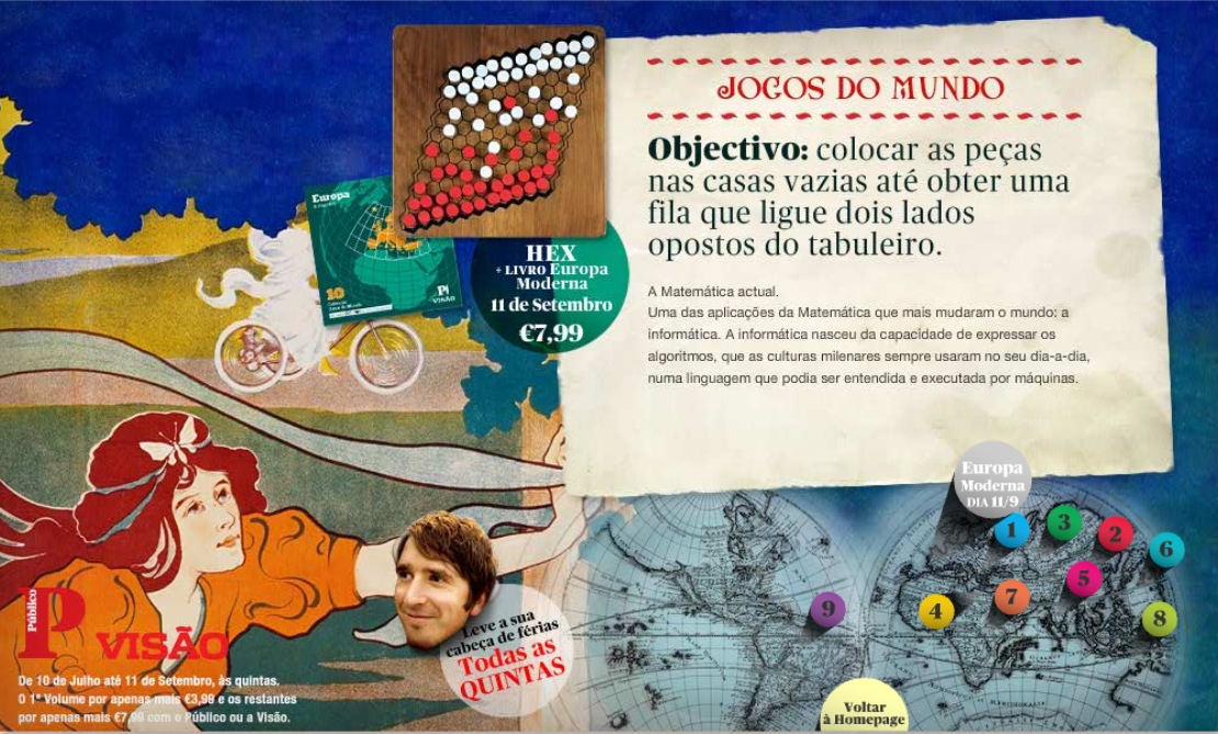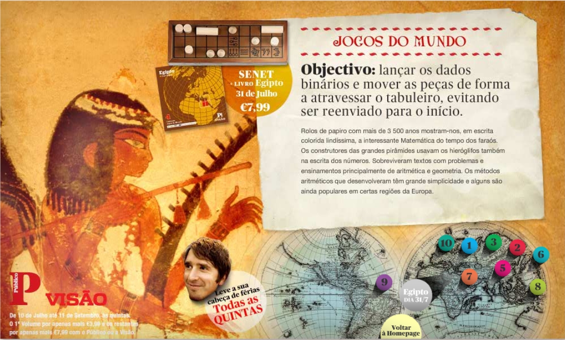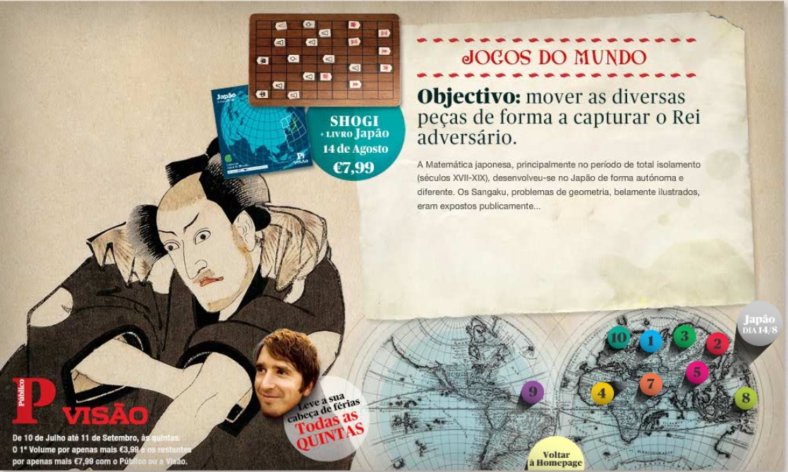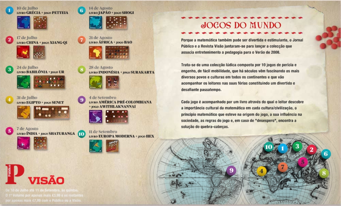 Juntamente com Jorge Nuno Silva e Carlos Santos, eu escrevi duas coleções sobre jogos de tabuleiro tradicionais e sobre a história da matemática, nomeadamente Jogos Com História (em 2007) e Jogos do Mundo (em 2008) em colaboração com o jornal Público e a revista Visão. Foi um grande sucesso, vendendo dezenas de milhar de livrinhos e kits com jogos de tabuleiro e puzzles matemáticos.Esta página é um arquivo (retirado do archive.org) dos anúncios da página Publico (que desapareceu há vários anos).