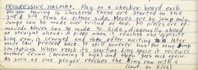 Progressive Halma is a 1964's game by Sid Sackson proposed in his diaries: