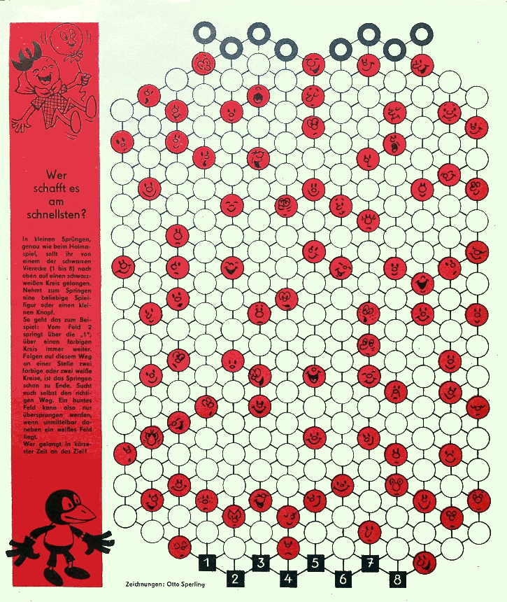 In small jumps, just like in the game Halma, you should move from one of the black squares (1 to 8) upward onto a black-and-white circle. Use any playing piece or a small button for jumping. Here’s how it works, for example: From square 2, jump over the “1,” over a colored circle, and continue further. If, at any point, two colored or two white circles follow one another, your jumping ends there. Find the correct path yourselves! A colored field can only be jumped over if there is a white field directly next to it. Who reaches the goal in the shortest time?