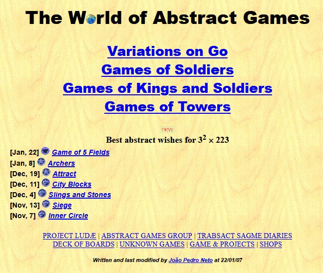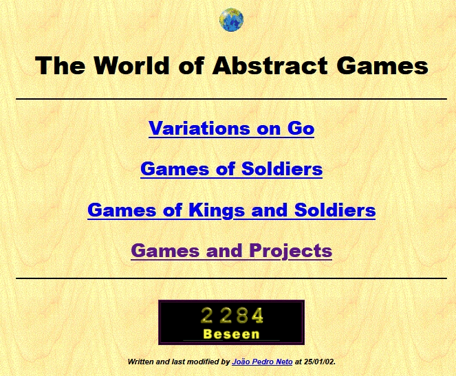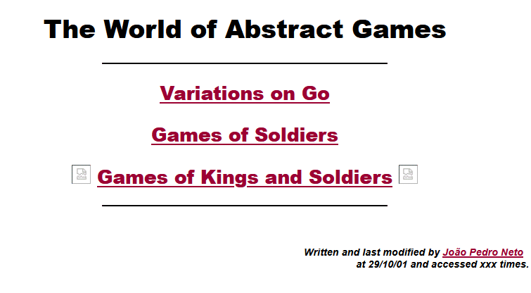 But going back to the year 2000, the Variations on Go website continue to grow and, especially at the time, there wasn't much online information about Go variants. So I decided to add a new section: games that could be played on a Go board (later, I included games for hexagonal boards). I called it Games of Soldiers, referring to games that could be played with just one type of piece (just like Go). And the site became more general, a website about...