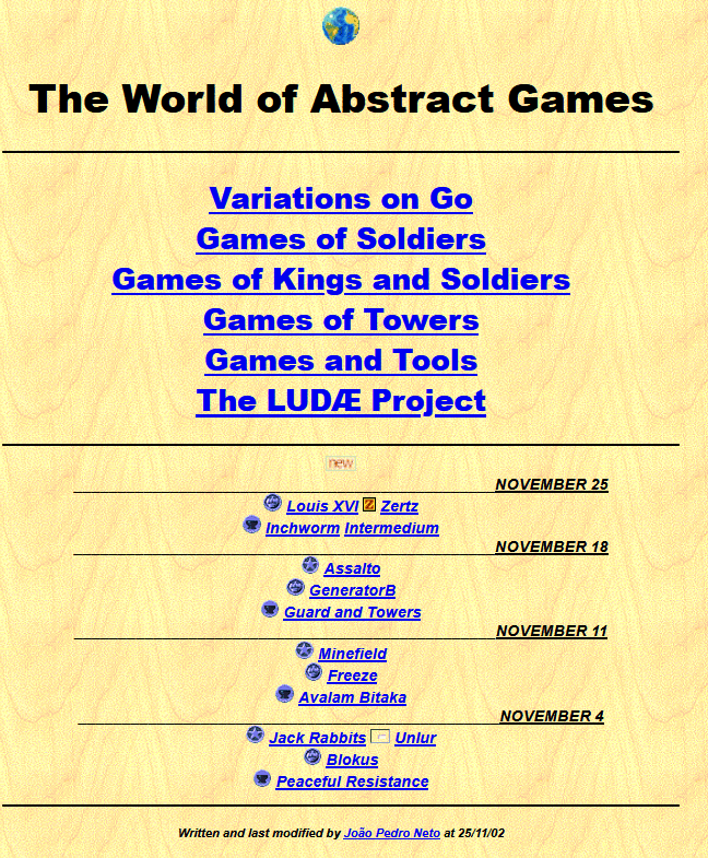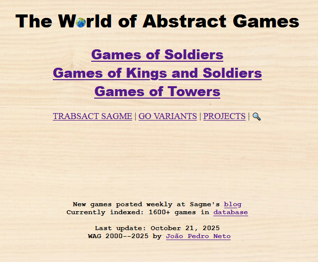 WAG's index page in 2025In 2025, I made many other updates to WAG: adding the content of old newsgroups (such as r.g.a,), creating new curated listings of games (the 19th and 20th century canons), compiling a timeline of the last 250 years of board games, and writing this biography. I also built a table-like database of abstract games up to the present day, assigning a set of ludemes to each game, something very useful to search for related games. On Board Game Geek, I collected the community's design contributions from the BGG forums into several geeklists.